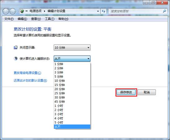 2、进入后,我们就可以更改计算机进入睡眠的时间,选择好计算机进入睡眠的时间后点击“保存”修改按钮即可;如下图所示: