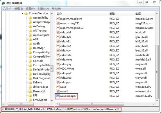2.在打开的注册表编辑器里找到HKEY_LOCAL_MACHINESOFTWAREMicrosoftWindows NTCurrentVersionDrivers32查看右边的窗口有没有“wavemapper”值。如下图所示