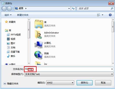 2、然后按Ctrl+A打开另存为窗口。在打开的“另存为”对话框中设置保存路径,然后在“文件名”文本框中输入文件名“hh.reg”,并点击“保存”,如下图所示:
