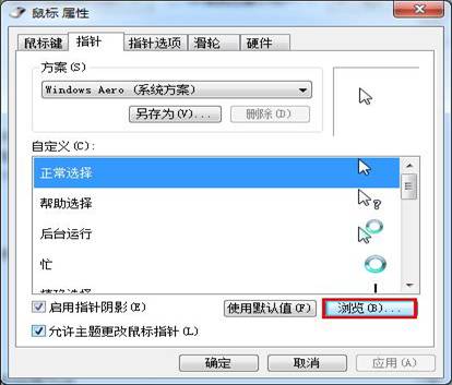 4、接着切换到“指针”标签,点击“浏览”按钮,如下图所示: