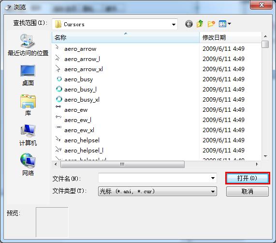 5、在打开的浏览窗口中,我们找到并选中下载的反向鼠标指针文件,然后点击“打开”按钮添加,如下图所示: