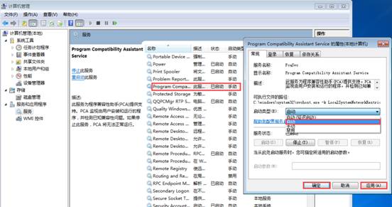 3、在窗口右侧中找到Application Experience和 Program Compatibility Assistant Service这2个服务项目,首先确定两个服务都是启动的,然后只要右键选择“属性”将其启动类型设置为“自动”即可,如图所示: