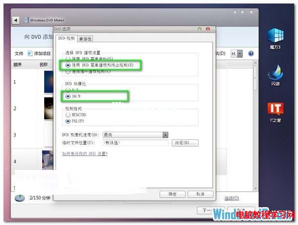 3、 接下来,我们就需要给视频添加效果了,点击【选项】,在弹出的“DVD选项”窗口中可以对DVD播放设置、DVD纵横比、视频格式和DVD刻录速度以及临时文件的位置进行设置。