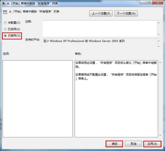 3、在弹出的窗口中,点击“已禁用”,然后按“应用—确定”按钮保存设置即可,如下图所示: