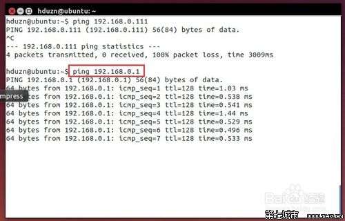 因为ping不通,看看网关是否可以ping通。如果网关可以ping通,说明问题在于本机上的设置,可能阻止的别人来ping它。在终端输入命令:ping 192.168.0.1,看到可以正常ping通网关。