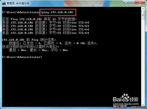 在命令提示符中输入命令:ping 192.168.0.101,看到已经ping通,正常接收到数据包。