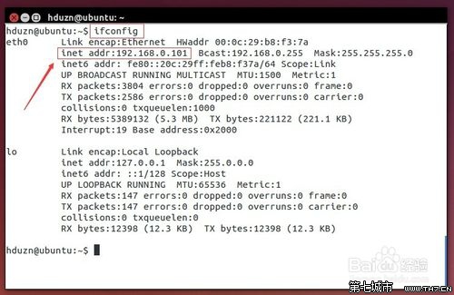 在ubuntu系统中打开终端,输入命令:ifconfig,注意:和windows系统下的ipconfig命令就差了一个字母。可以看到ip地址是:192.168.0.101