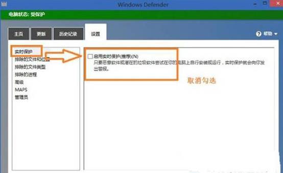 2、打开windows defender界面后,切换到设置选项卡,点击“实时保护”,然后将取消“启用实时保护(推荐)”前的勾选,然后点击确定保存即可,如下图所示: