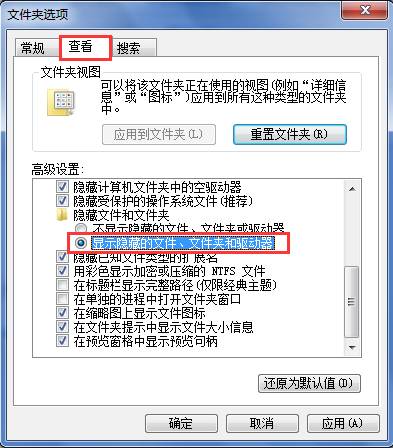 在弹出的文件夹选项界面中,点击“查看”标签,然后找到“显示隐藏的文件、文件夹和驱动器”,将其勾选,最后按确定,如图所示: