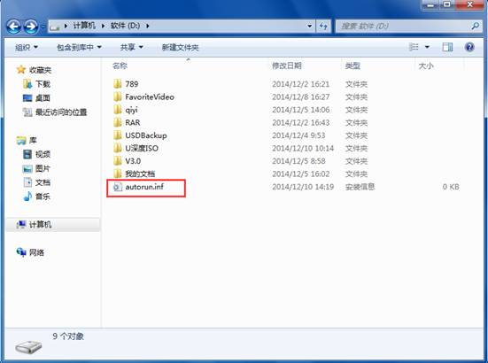 完成后打开出现显示异常的硬盘,在该盘中找到autorun.inf文件并将其删除,然后重启电脑即可。如图所示: