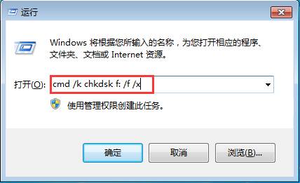 在桌面上打开运行窗口(win+r键),输入cmd /k chkdsk f: /f /x,其中f为出现问题的盘符,按回车键确定,如图所示: