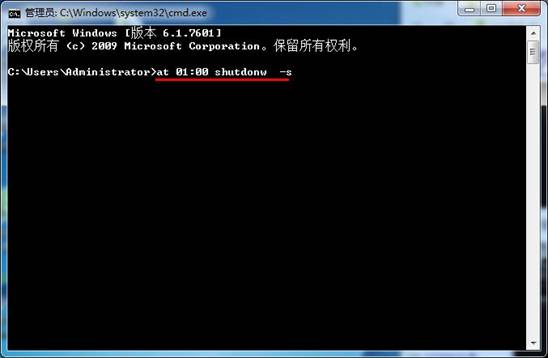 2、打开管理员命令提示符窗口后,在光标闪动处输入at 01:00 shutdonw -s(01:00这里指的是我们所设置的关机时间),回车执行即可,如下图所示: