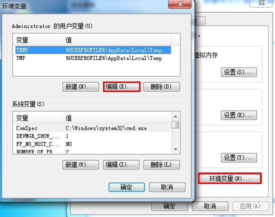 4、在弹出的系统设置窗口中,点击切换到“高级”选项卡,然后点击“环境变量”。此时会弹出环境变量窗口,我们在用户变量列表中分别对“TEMP”和“TMP”执行编辑操作,将变量值(即临时文件存放地址)设置为系统盘以外的其他位置即可,如下图所示: