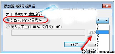 五、我们可以选择一个驱动器号给它,这个驱动器号就是我们接下来要给它分配的U盘盘符,在这里我们选择的G,选择完成后点击确定即可。