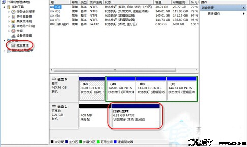 二、在计算机管理界面中选择磁盘管理,在这儿,我们可以很清楚的看到有一个“可移动”的磁盘。这个就是我们要找的U盘,细心的我们可以发现那个“可移动”的磁盘只是没有磁盘盘符号。当然,我们只要给U盘添加磁盘盘符号即可。