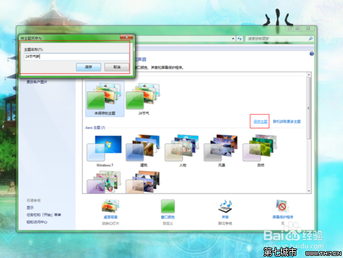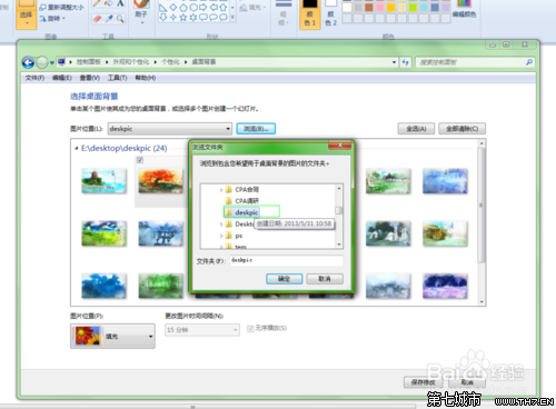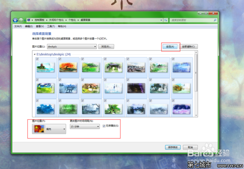 5、这是系统会读取文件里的一张设置成你的桌面,如何让文件里全部图片轮播呢?点击一下“全选”,让系统勾选你文件里的全部图片,”图片位置“,“图片间隔时间”可根据需要选择,如图7;到此设置完成。如果你想将这些保存成主题,只需如图8,选择保存主题,命名主题,即可。
