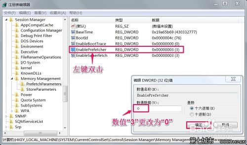 5、在PrefetchParameters对应的右侧窗口,找到:EnablePrefetcher,并左键双击:EnablePrefetcher; 在弹出的编辑 DWORD(32位)值窗口,把EnablePrefetcher的数值数据(V)从“3”更改为“0”,再点击:确定;