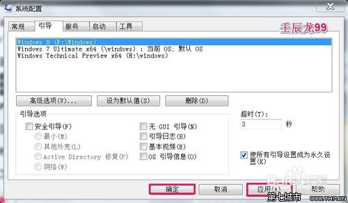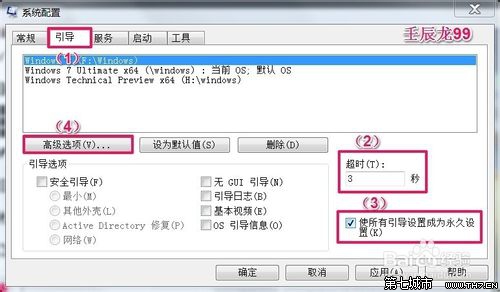 8、在打开的系统配置窗口:(1)点击:引导,(2)在超时(T)处,把“30”更改为“3”,(3)点击:使所有引导设置成为永久设置打上勾,(4)点击:高级选项(V)...;