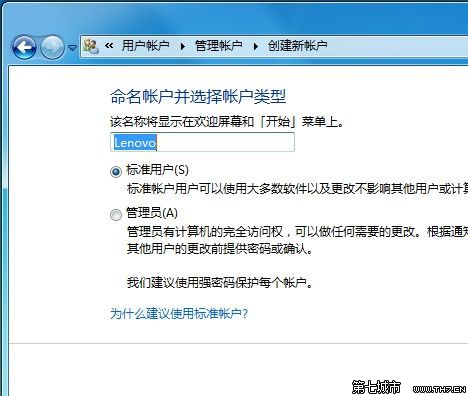 6,打开“创建新账户”界面后,在中间的白框中可以输入要创建的账户名,例如:Lenovo,类型可以选择:“标准账户”和“管理员”两种。