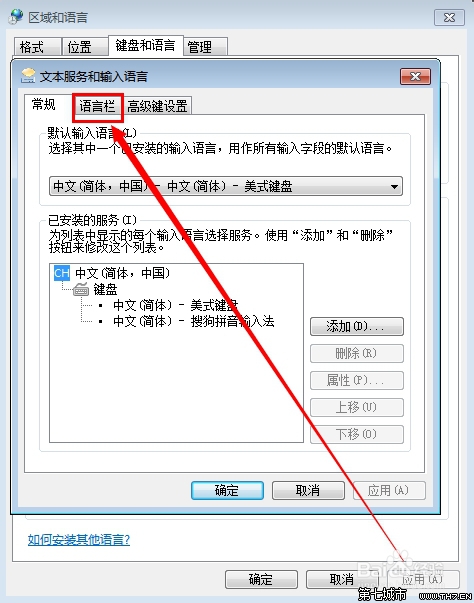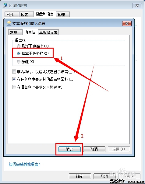 在文本服务和输入语言设置窗口里点击“语言栏” 如图