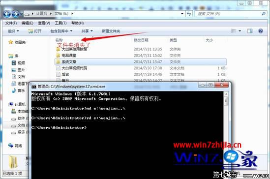 3、文件创建完成了,如果要删除该文件夹的话,在cmd模式下输入rd命令“rd e:wenjian..”回车即可。