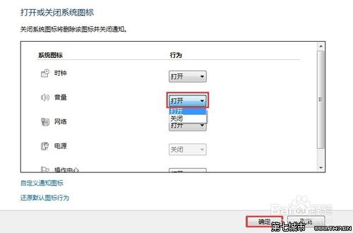 4、在出现的界面中,找到音量,将后面的行为设置成“打开”,然后点击确定,如图所示: