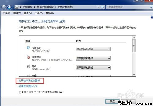 3、在弹出的菜单中,我们找到“打开或关闭系统图标”,然后打开,如图所示: