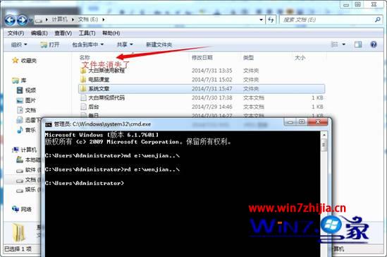 3、文件创建完成了,如果要删除该文件夹的话,在cmd模式下输入rd命令“rd e:wenjian..”回车即可。