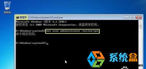 7、在命令提示符中执行以下命令:net user administrator /active:yes 回车,等执行完毕;