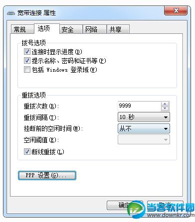 步骤四:随之在宽带连接的属性界面中,切换到“选项”标签页,然后在“选项”中找到PPP设置按钮,打开它。