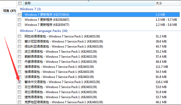 在窗口中点击“34个可选更新”链接,在可以下载安装的语言包列表中选择“繁体中文语言包”,确定即可。