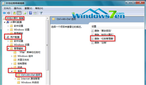 2、然后在打开的窗口中,依次展开“本地计算机策略”—“用户配置”—“管理模板—“系统”—“Ctrl+Alt+Del选项”,然后在窗口右侧中找到并双击“删除任务管理器”选项;如图2所示