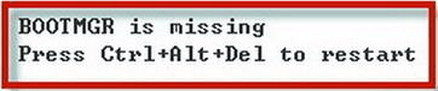 故障表现:每当开机时,都会出现图4所示的错误提示信息,同样不能正常地登录系统。该错误提示,翻译成汉语就是Bootmgr丢失,按Ctrl+Alt+Del重新启动。