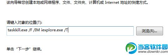 2.然后在输入对象的位置中输入:taskkill.exe /F /IM iexplore.exe /T并点击下一步。