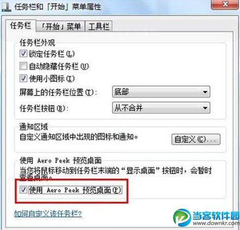 第一步、鼠标右击桌面上的“Windows”图标,选择“属性”,打开“任务栏和开始菜单属性”菜单,接着切换到“任务栏”选项卡,查看是否勾选了最下方的“使用Aero Peek预览桌面”前的复选框,假如没有,勾选之,勾选后点击“确定”按钮保存设置,如下图所示: