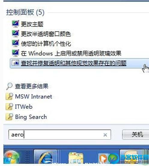 第二步、执行完第一步后如果问题依旧,我们可以选择进行检测。点击“Windows”图标,在搜索框中输入“Aero”,接着选择“查找并修复透明和其他视觉效果存在的问题”,如下图所示: