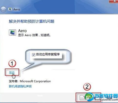 第三步、打开Aero窗口后,选择“高级”,紧接着字样会变更为“自动应用修复程序”,系统会自动修复程序,然后点击“下一步”按钮即可,如下图所示: