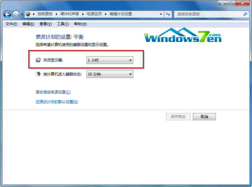 5、然后就可以点击关闭显示器后面的下拉按钮选择关闭的时间,然后点击保存修改即可。