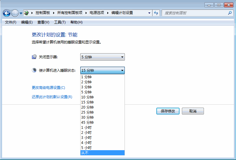 然后在“使计算机进入睡眠状态”点开下拉菜单选择“从不”,确定保存。