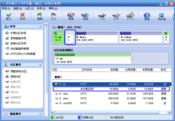 3、当你松开鼠标时,你将看到在C盘后产生了一块19.99GB的未分配空间(蓝色框圈住的地方),如下图3,这块空间就是压缩出来的,同时我们可以继续使用分区助手将这块空间分配给D盘使用。