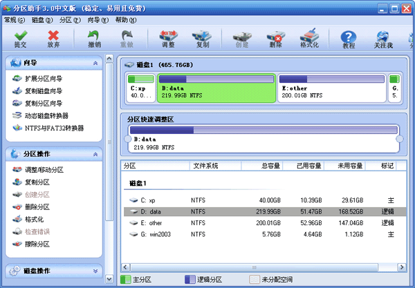 1、下载免费的分区助手,安装并运行它。在主界面上你可以看到C盘有60GB的空间,D盘有200GB的空间,如图1。这个例子将压缩C盘到40GB将压缩出的空间分配给D盘使用,使D盘达到大约220GB的空间。