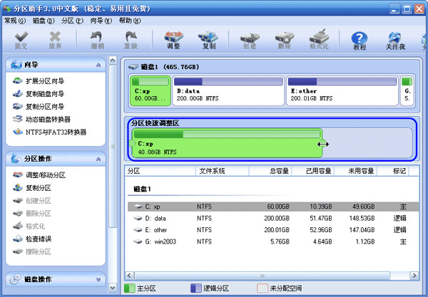 2、这步的目标是缩小C盘,请选中C盘并移动鼠标到“分区快速调整区”的最右端,然后当鼠标指针变成双向箭头时,点击圆形的手柄并向左拖动鼠标来缩小这个分区到40GB,如下图2所示:(你也可以右击C盘选择“调整/移动分区”选项来缩小C分区)
