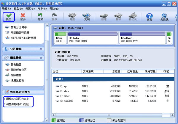 6、最后不要忘记点击工具栏上的“提交”按钮来执行真实的操作,另外你可以在主界面上看到等待执行的操作中有两个操作(蓝色框圈住的地方),如下图6,即把这个操作保存到磁盘上。执行过程中可能需要花一会时间,所花时间的长短由分区中的数据的多小而定。这需要你耐心地等待,绝对不要强行终止程序。