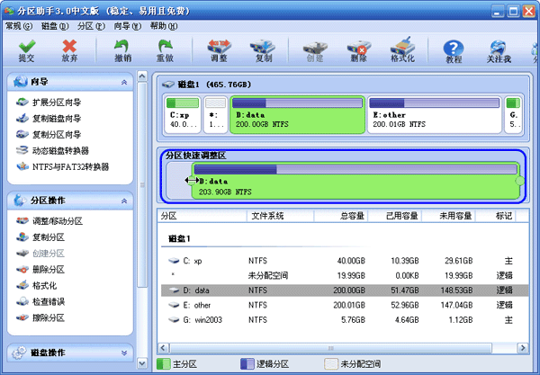 4、点击D盘,并移动鼠标到“分区快速调整区”的最左端,然后当鼠标指针变成双向箭头时,点击圆形的手柄并向最左边拖动鼠标以让D盘占用这19.99GB的未分配空间,如下图4所示:(你也可以右击D盘选择“调整/移动分区”选项来设定D分区的新大小)