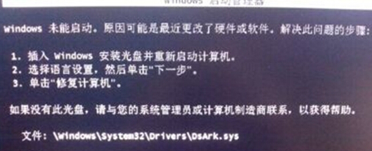 一般情况下,出现上述电脑开机出现“DSARK.sys损坏”提示,是由于win7系统关键驱动程序丢失或损坏,导致Windows无法加载的。