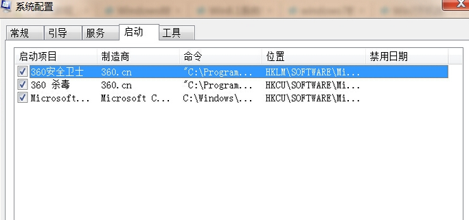 2、在打开的“系统配置”窗口,将界面切换至“启动”栏,可以查看到系统启动项目,保留“输入法”和“杀毒软件”;