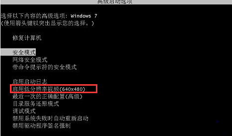 重启系统,开机按下F8键进入到“高级设置”菜单,进入到“VGA模式(低分辨率模式)”,然后设置一个比较低的分辨率保存后,进入“正常模式”,最后再设置一个正确的分辨率。