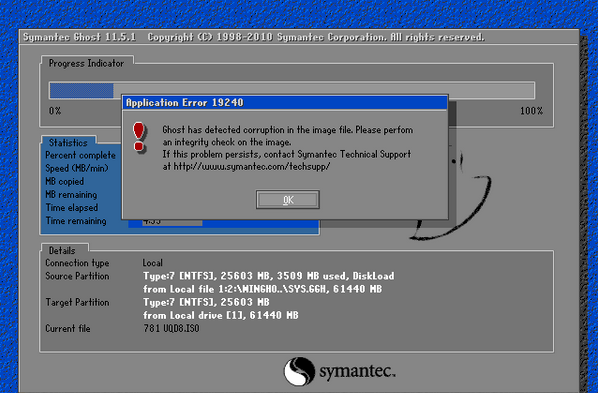最近有用户在安装Win7系统的过程中出现Application Error 19240提示,导致安装系统出错,内容提示大致为“Ghost has detected corruption in the image file(如下图)”从错误代码的提示中可以解读出这是由于iSO镜像文件出现损坏,所以在安装过程中才导致了问题的产生,因此无法进入下一步操作,该怎么解决呢?下面小编就来详细的介绍下安装Win7系统时出现Application Error 19240提示的解决方法。