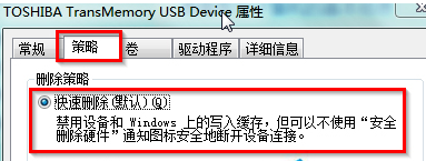 3、然后会弹出下图中所示的移动硬盘的属性窗口,直接将其切换到策略选项,再选中快速删除,再点击确定,退出窗口就可以了。