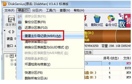 然后我们在diskgenius分区工具选择我们想要修复的磁盘。在打开的diskgenius主界面,我们需要用鼠标点击菜单栏,然后找到“硬盘——重建主引导记录”这一选项,最后用鼠标点击这一选项即可。